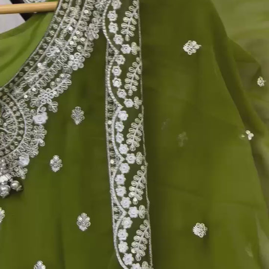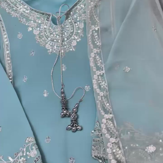 Upgrade your festive and party wardrobe with Astha Collection’s AC-7073 Premium Designer Set ✨. Crafted in Heavy Fox Georgette fabric, this elegant outfit features intricate sequence embroidery work with fancy latkan details that add a touch of sophistication. The set comes with a fully stitched embroidered top, free-s