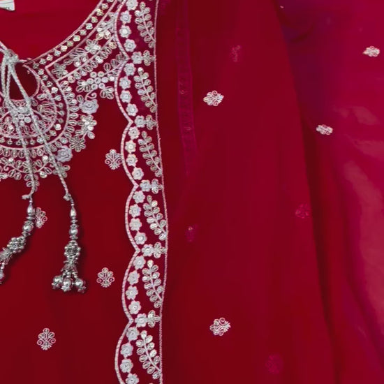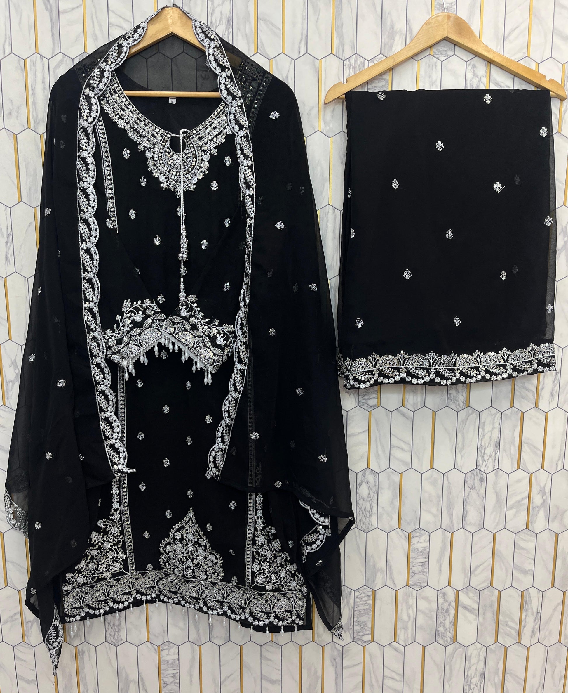 Upgrade your festive and party wardrobe with Astha Collection’s AC-7073 Premium Designer Set ✨. Crafted in Heavy Fox Georgette fabric, this elegant outfit features intricate sequence embroidery work with fancy latkan details that add a touch of sophistication. The set comes with a fully stitched embroidered top, free-size plazzo with full flair, and a matching embroidered dupatta, making it a complete ready-to-wear ensemble.